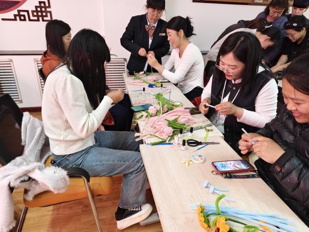 手工花朵制作区欢声笑语不断,社区居民与志愿者们用彩纸、丝带等材料制作出一朵朵栩栩如生的康乃馨。指尖轻捻,花瓣层叠绽放,欢声笑语中,每一份专注的眼神和上扬的嘴角,都让这个母亲节的暖意愈发浓郁。