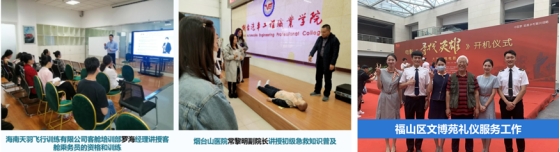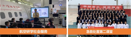 在社会服务方面,依托航空服务实训中心打造的民航特色科普基地,面向幼、小、初、高开发全学龄航空服务职场体验研学项目,目前项目已落地运营。该实训基地也获评“烟台市中小学研学基地”、“烟台市优秀研学课程”、“烟台市社会实践大讲堂(A类)”、应急救护培训基地、市级研学基地、社会大课堂活动场馆、中小学综合实践教育基地,尉玮团队获评“烟台市科普团队”。